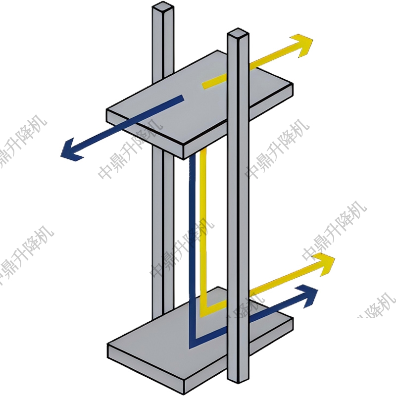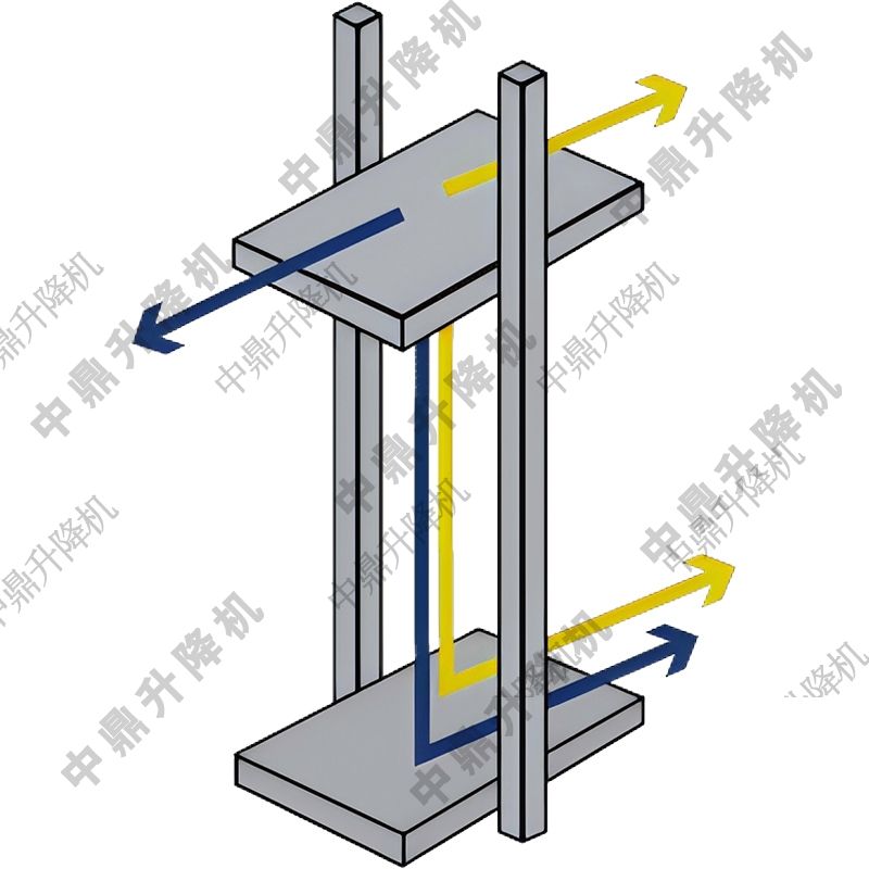 跨坐式往復式提升機的貨廂位于兩個導軌柱之間,能夠有效將負載的重量沿兩個柱子均勻分布。這種配置相比懸臂式配置,具有更大的承載能力和更大的貨廂平臺尺寸,能夠承受更高的翻車力(即在裝卸過程中產生的力)。跨坐式布局支持C型裝卸(從前方進行裝卸)和Z型裝卸(從對側進行裝卸)兩種方式,特別適用于空間不受限制且負載高度要求不無限制的應用場合。